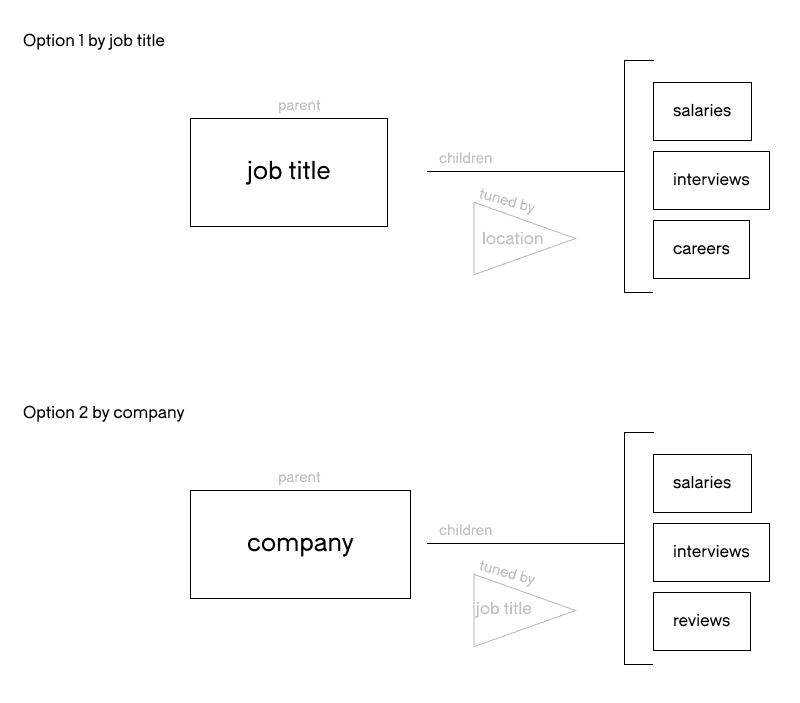 My first project with Glassdoor was focused on improving the global navigation structure while aligning it to the new visual language and creating space for the addition of Community. Using a fact-based approach, I modeled out the types of content Glassdoor had and their relatedness. This helped create an understanding of how to surface content to users. This aligned with prior research done around job users preferences, which surfaced how users identified different terminology. Then, I referenced click through rates for all categories currently displayed on global navigation.